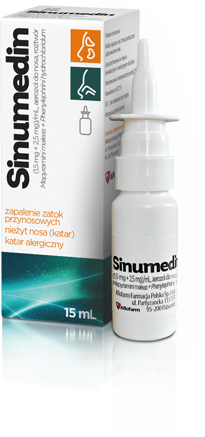 Sinumedin, aerozol do nosa, roztwór. Skład: 1 mL aerozolu do nosa zawiera 1,5 mg mepiraminy maleinianu (Mepyramini maleas) i 2,5 mg fenylefryny chlorowodorku (Phenylephrini hydrochloridum). Pojedyncza dawka rozpylona zawiera 0,15 mg mepiraminy maleinianu oraz 0,25 mg fenylefryny chlorowodorku. Wskazania: Nieżyt nosa (katar), także alergiczny, zapalenie zatok. Podmiot odpowiedzialny: Aflofarm Farmacja Polska Sp. z o.o., ul. Partyzancka 133/151, 95-200 Pabianice